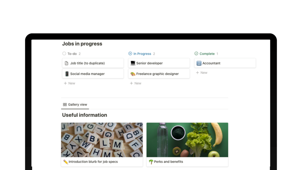 If you are struggling to keep up with your hiring process, here is your solution! This Company's Hiring Hub is designed to provide teams with a structured space to find the perfect candidate. From a Kanban board for job roles to a hub for storing important information such as standardised wording for job specs, company benefits, and contracts, this Hiring Hub allows teams to stay organised in one place.
